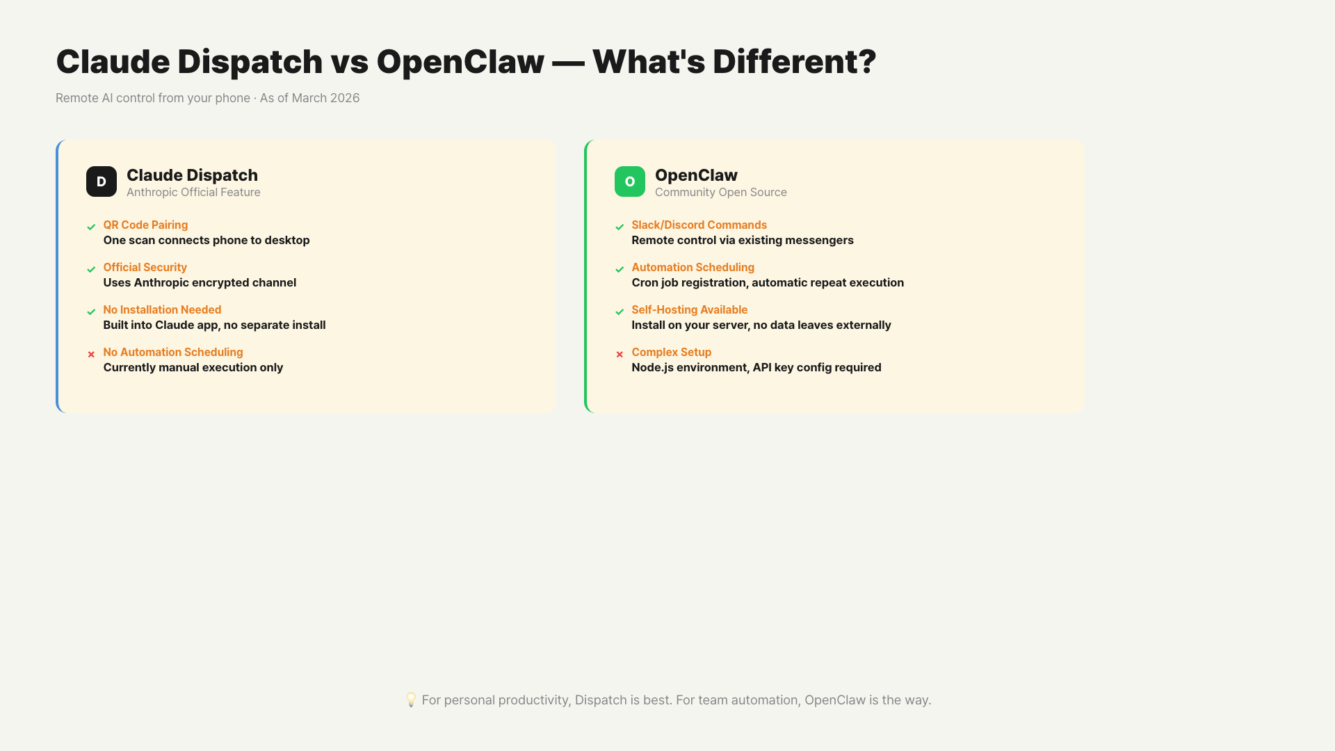If you use Claude Max and have development experience, it’s best to use both tools separately. Handle quick personal tasks (file summaries, document writing) with Dispatch. Set up repetitive automation, team-shared workflows, and browser tasks with OpenClaw. It’s not about choosing a tool — it’s about distributing them.