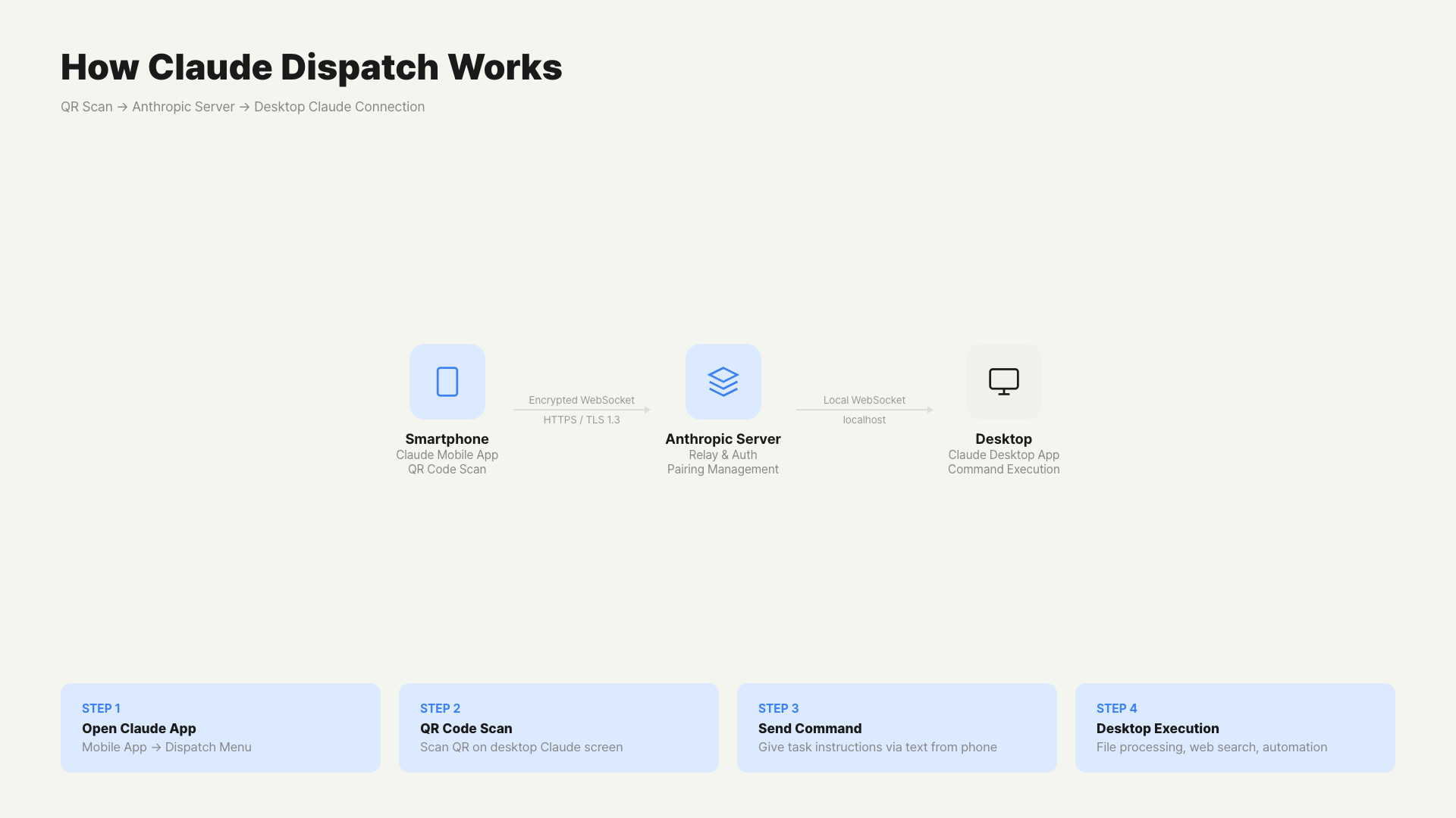 It goes through Anthropic servers. After QR code pairing, it uses an encrypted WebSocket channel. Anthropic’s existing security policies apply as-is. Since data passes through Anthropic servers, it’s not fully local processing. Without an enterprise contract, you can’t control where data is processed.