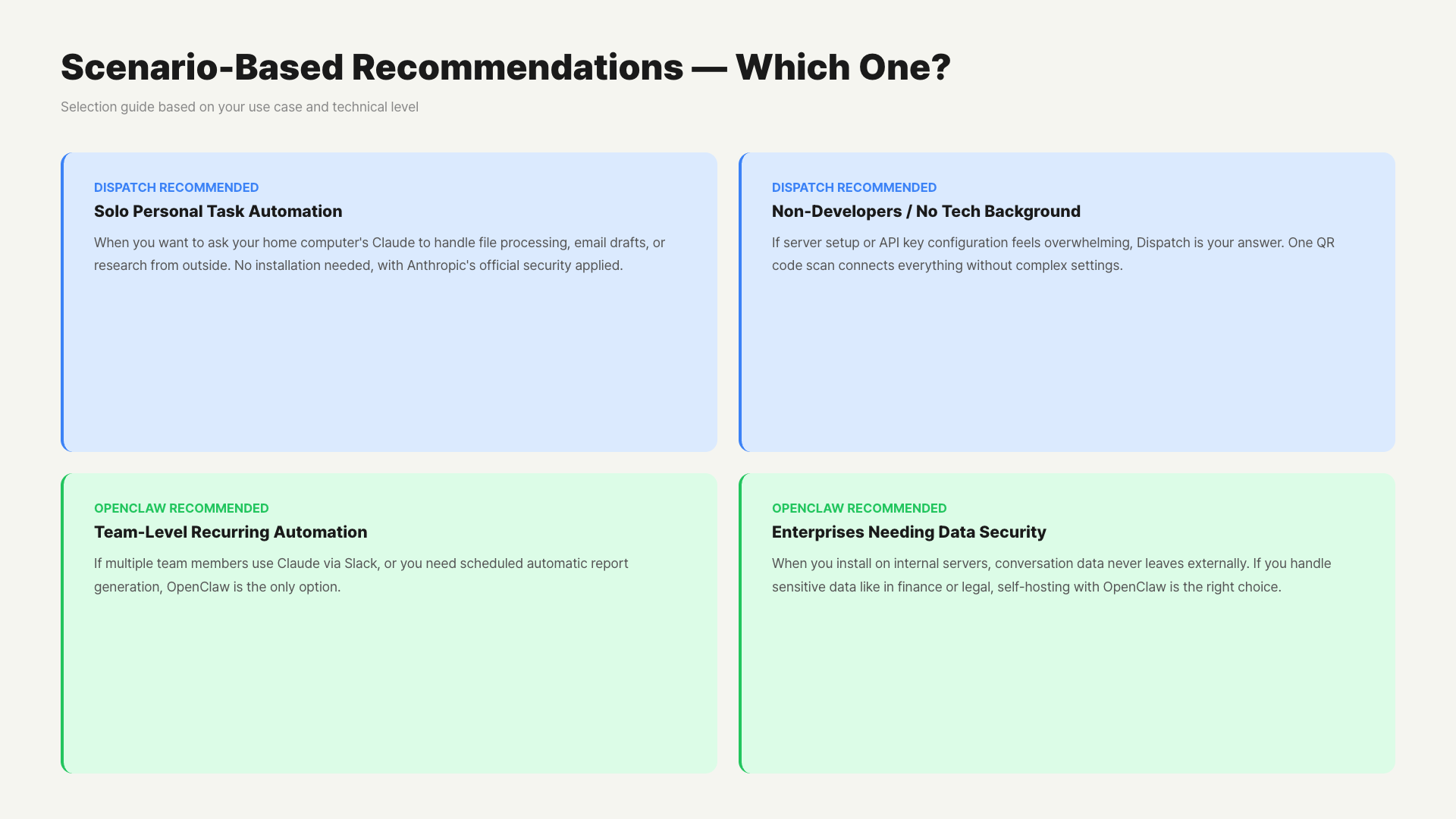 For tasks involving important work files or internal company data, building a self-hosted OpenClaw on an internal server is safer. Claude Dispatch is currently best suited for personal productivity use.