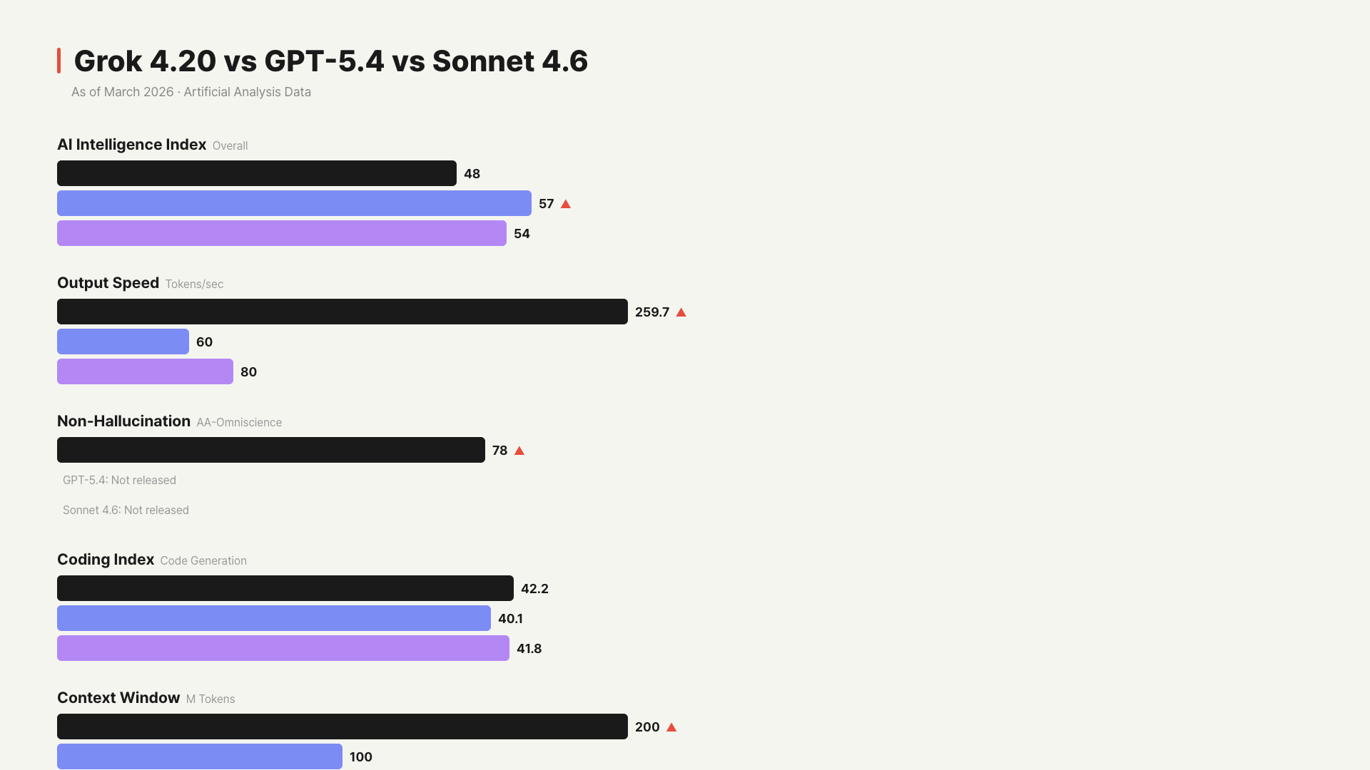 Looking at the numbers alone, GPT-5.4 is the smartest, Grok 4.20 is the fastest, and Claude Sonnet 4.6 is strongest at coding.