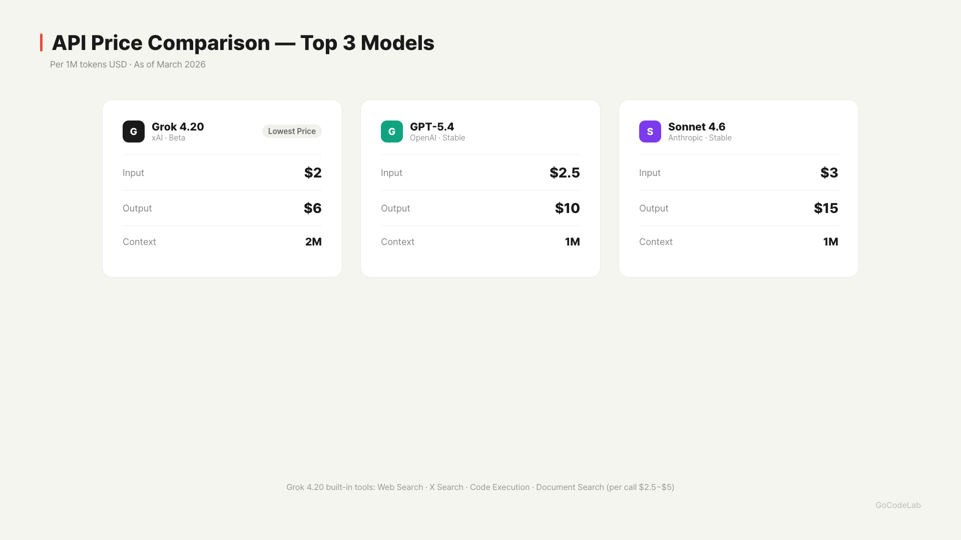 Grok 4.20’s output cost of $6/M is clearly cheaper than GPT-5.4 ($10/M) and Sonnet 4.6 ($15/M). The cost difference adds up for output-heavy tasks.