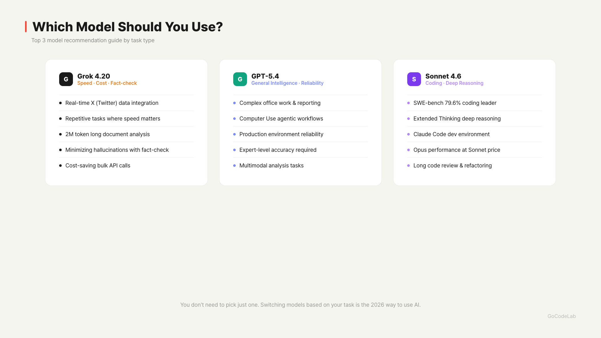 Grok 4.20 Beta 0309 introduced a new approach to AI model design. The structure of 4 agents debating rather than a single model actually worked for reducing hallucinations and coding performance. It has clear advantages in speed, cost, and non-hallucination rate, but still falls short of GPT-5.4 and Gemini 3.1 Pro in general intelligence. However, it’s updating weekly and has a stable release coming in Q2, so future improvements are worth watching. The 2026 AI market is no longer about “one best model” — it’s about choosing the right model for the right task. Grok 4.20 is definitely a meaningful addition to those choices.If this Grok 4.20, GPT-5.4, and Claude Sonnet 4.6 comparison was helpful, subscribe to the GoCodeLab blog. We’ll test and compare every new model that comes out.