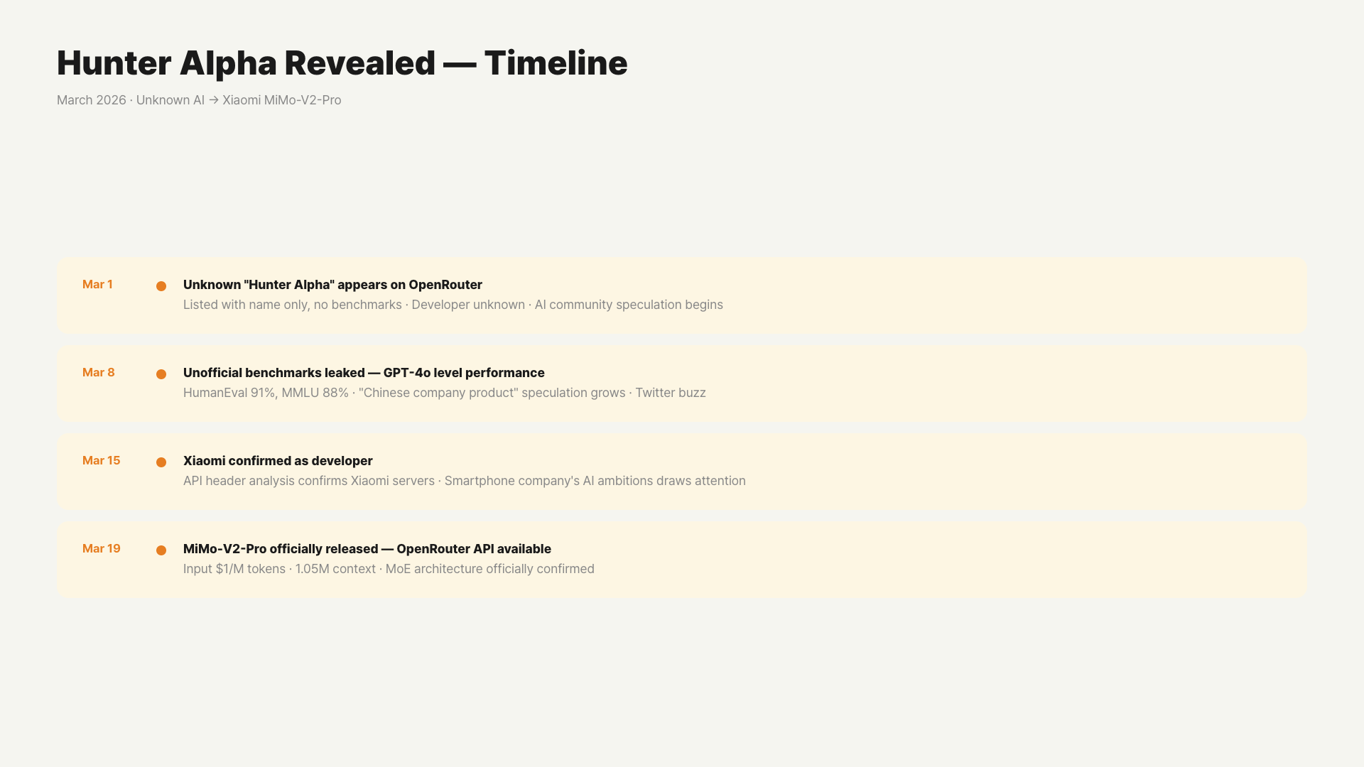 • March 18-19: Xiaomi makes the official announcement. Hunter Alpha = MiMo-V2-Pro. Reveals 1 trillion tokens processed during test period.