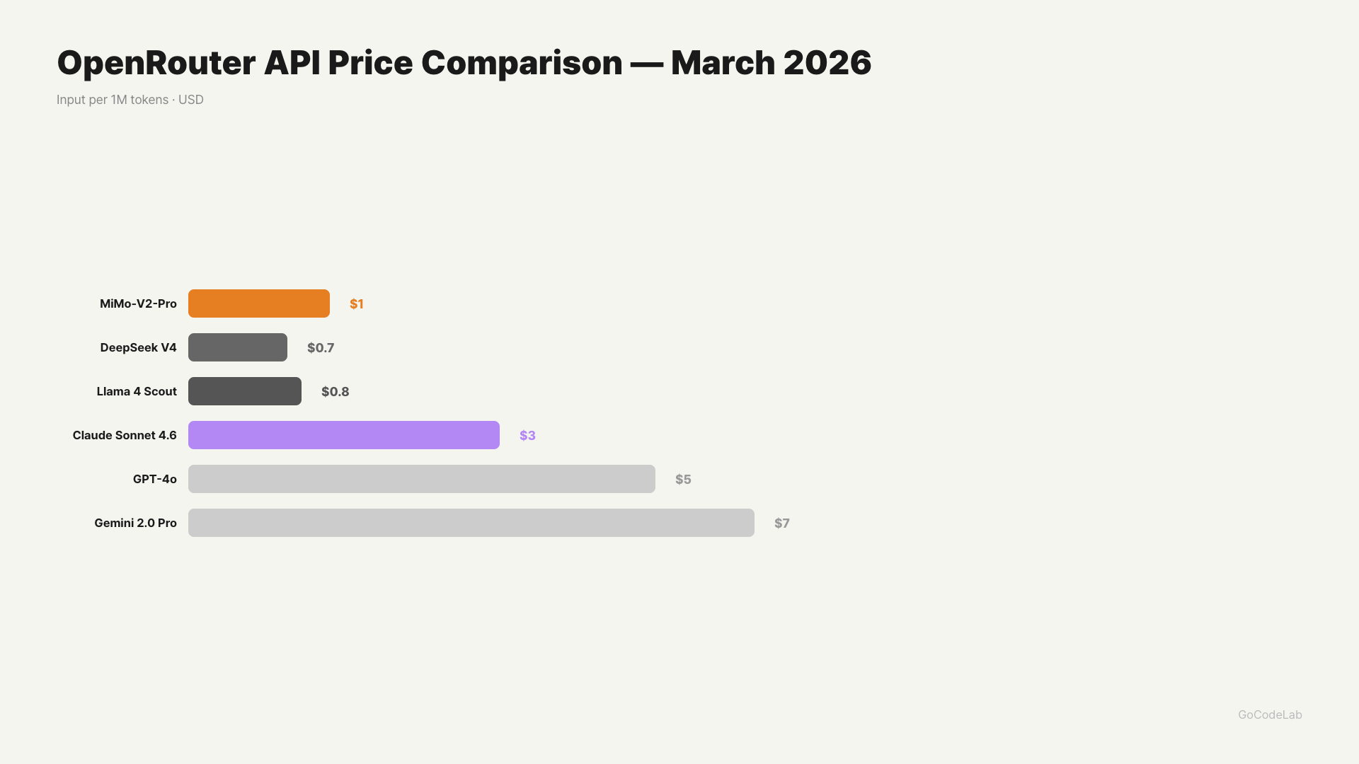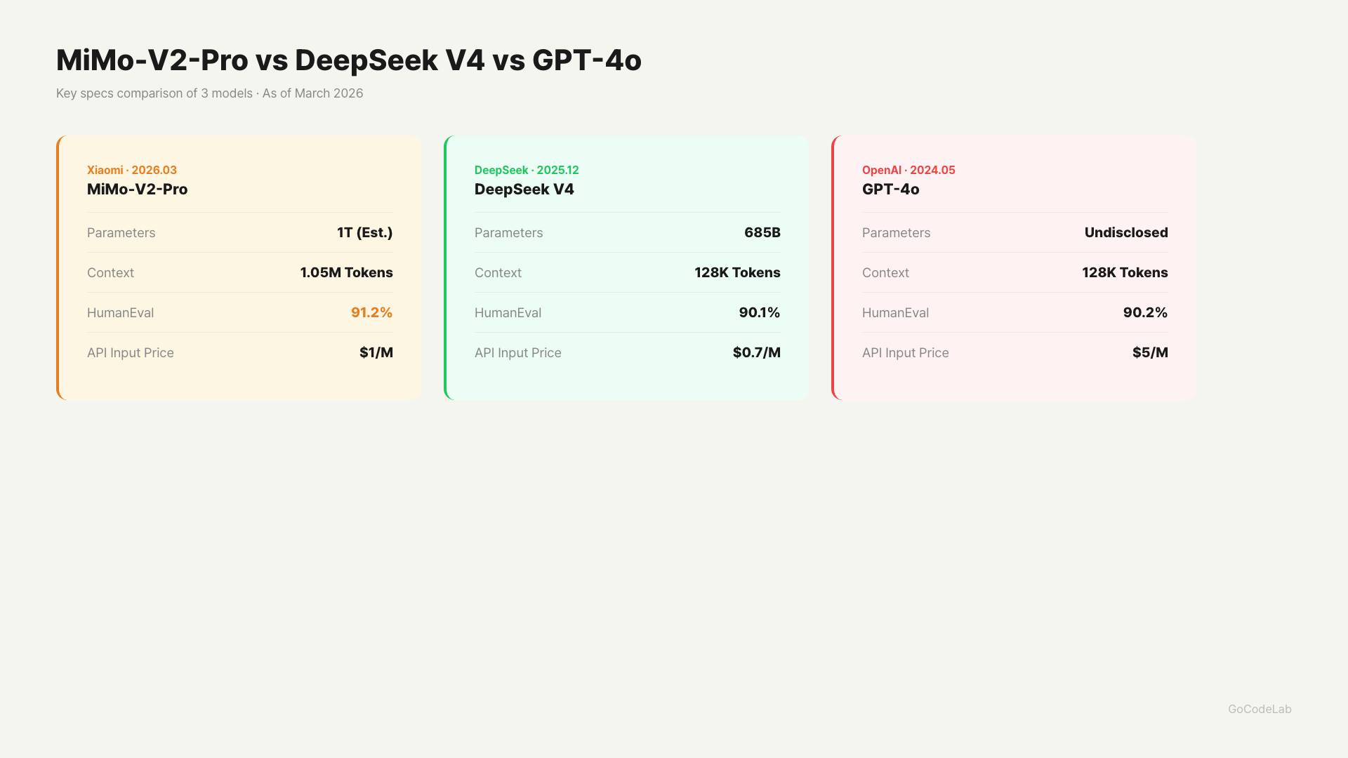 MiMo-V2-Pro $1/M input vs GPT-4o $5/M input — 80% cheaper / GoCodeLab