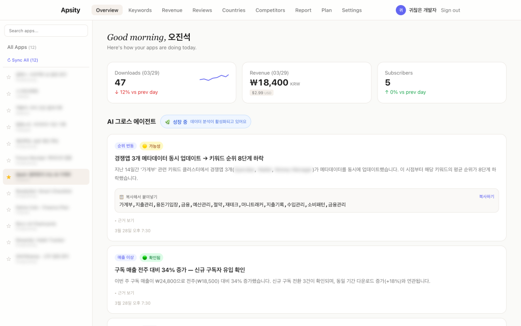 Apsity 대시보드로 앱 12개 수익은 보이는데, 그래서 뭘 해야 할지는 여전히 몰랐다. AI 그로스 에이전트를 만들었다. 48개 인사이트가 자동