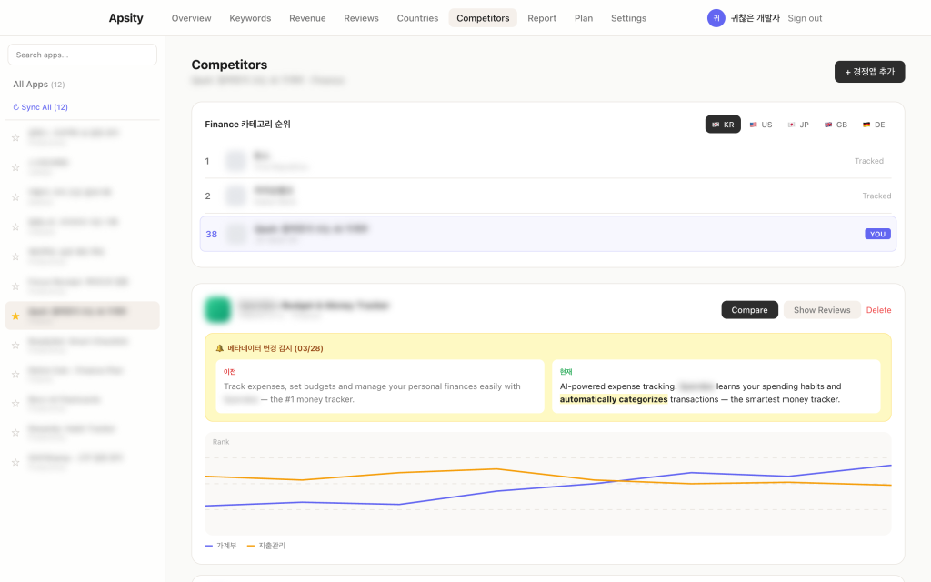 메뉴를 열면 등록된 경쟁앱 목록이 나온다. 최근 메타데이터 변경이 있는 앱이 상단에 올라오고, 어떤 필드가 바뀌었는지 표시된다. 변경된 필드를 클릭하면 이전 버전이랑 현재 버전을 나란히 볼 수 있다. 아이콘이 바뀌었는지, 설명 문구가 어떻게 달라졌는지까지 텍스트 diff로 확인된다.