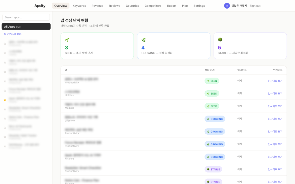 앱마다 다른 종류의 인사이트가 들어왔다. 가계부 앱은 STABLE이라 매출 이상치 감지가 돌았고, 루틴 앱은 GROWING이라 경쟁앱 변화 감지가 같이 돌았다. 갓 출시한 앱 하나는 SEED라서 키워드 자동 생성 인사이트만 나왔다. 단계가 다르니까 인사이트 종류도 달랐다.