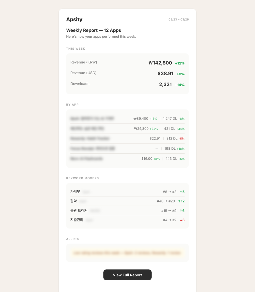 인사이트가 생겼는데, 대시보드를 열어야만 볼 수 있다는 게 마음에 걸렸다. 열지 않으면 놓친다. 월요일 아침을 Apsity 대시보드를 열기 전에 이미 한 주가 어땠는지 알고 시작하면 좋겠다고 생각했다. 그래서 주간 리포트를 이메일로 자동 발송하기로 했다.