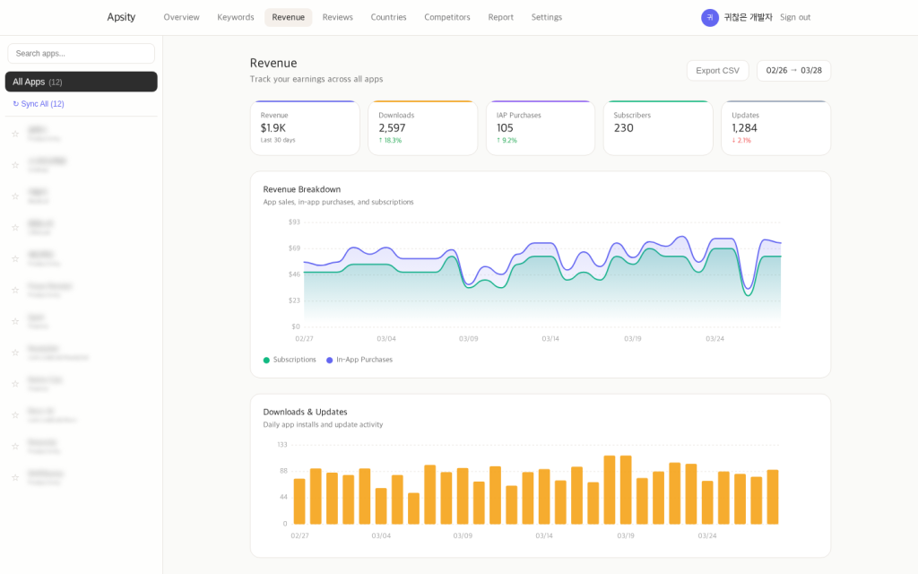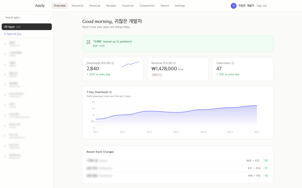 나는 이 12개 앱의 수익, 다운로드, 키워드 순위를 한 화면에서 보는 대시보드를 직접 만들었다. Apsity라는 이름을 붙였다. App Store Connect API를 연결하고, 매일 새벽에 데이터를 자동으로 가져오게 만들었다. 이 글은 그 과정의 개발 일지다.