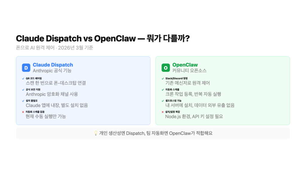 Claude Dispatch vs OpenClaw — 폰으로 AI 원격 제어, 어떤 게 맞을까요?