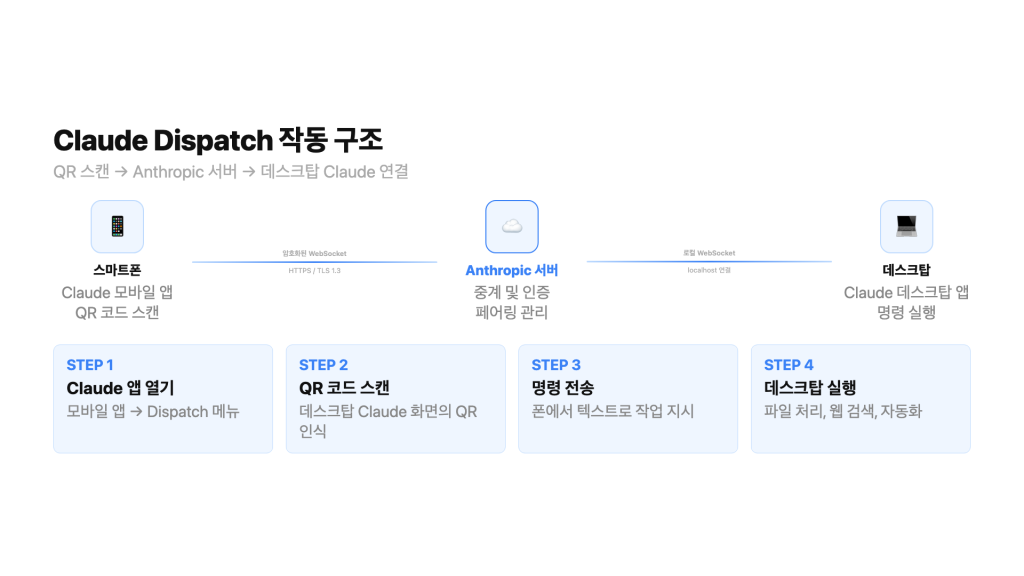 Claude Dispatch는 QR코드 페어링으로 두 기기를 직접 연결해요. 서드파티 서버를 거치지 않아요. 연결 중에 API 키가 외부에 노출되지 않아요. 보안 설정을 따로 신경 쓸 필요가 없어요.