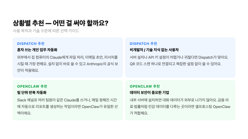 중요한 업무 파일이나 기업 내부 데이터를 다루는 작업이라면, OpenClaw 셀프호스팅 버전을 내부 서버에 구축하는 게 더 안전해요. Claude Dispatch는 개인 생산성 용도로 쓰는 게 현재로선 적합해요.