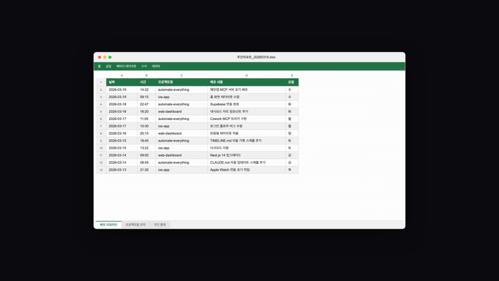매주 월요일 오전 8시, 주간 배포 리포트. TIMELINE.md가 프로젝트마다 쌓이면 이것도 자동화할 수 있다. 월요일 아침 8시에, 모든 프로젝트의 TIMELINE.md를 전부 읽고 지난 7일치 배포 기록을 파싱해서 엑셀로 만들어준다. 어떤 프로젝트에서 몇 건 배포했는지, 날짜별로 뭘 올렸는지 한눈에 볼 수 있다. 월요일 첫 업무를 시작하기 전에 이미 지난 주 요약이 폴더에 들어와 있다.