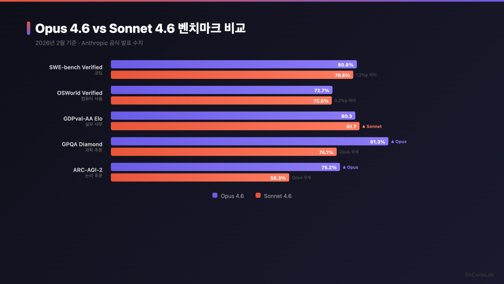 | 항목 | Opus 4.6 | Sonnet 4.6 | 격차 |