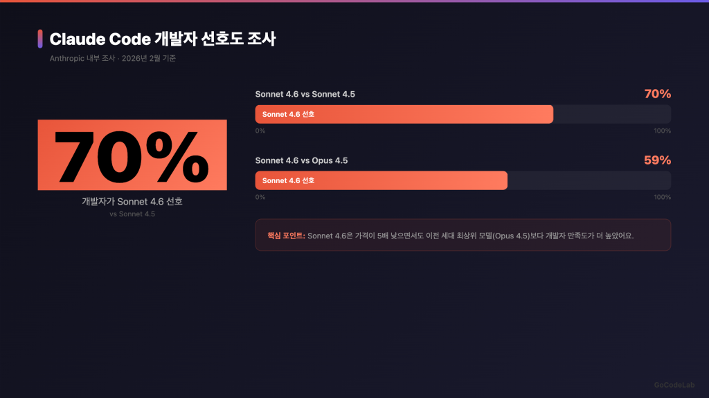 개발자는 Claude Code에서 Sonnet 4.6을 기본으로 쓰는 게 효율적이에요. 코딩 성능 차이가 1.2%p밖에 안 되니까요. 정말 복잡한 아키텍처 설계가 필요할 때만 Opus를 쓰면 돼요.
