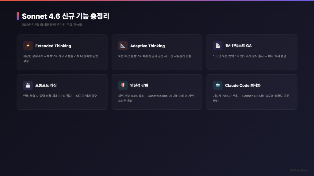 Sonnet 4.6은 확장 사고를 지원해요. 어려운 문제를 만나면 답변 전에 내부적으로 더 오래 생각하는 기능이에요.