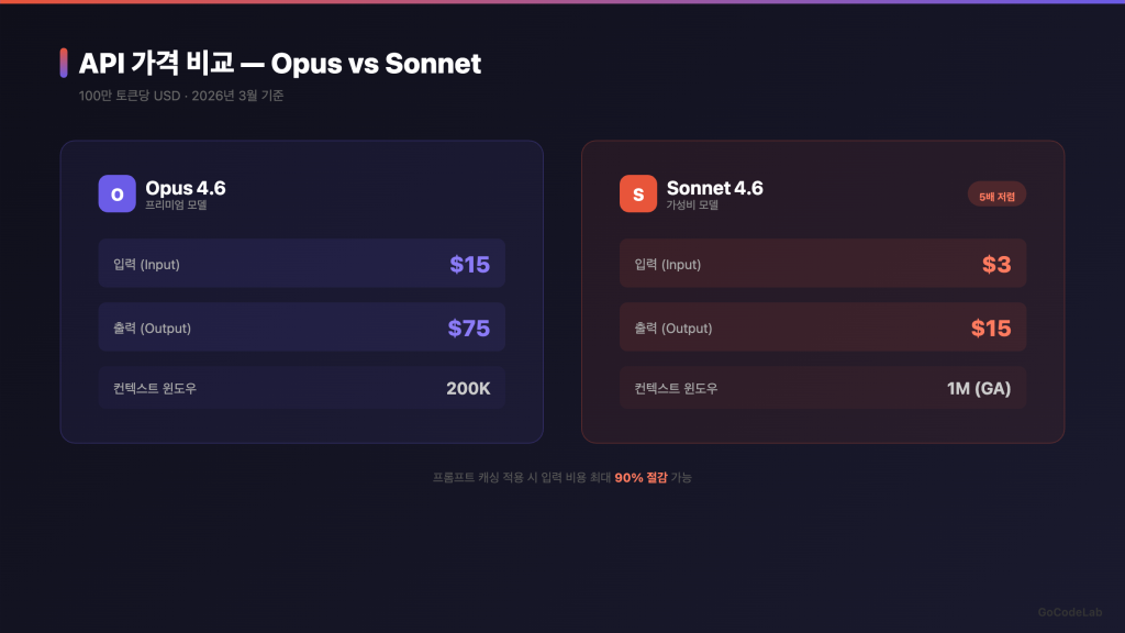 Sonnet 4.6은 입력 1M 토큰당 $3, 출력 $15예요. Opus 4.6은 입력 $15, 출력 $75예요. 5배 차이가 나요. 프롬프트 캐싱을 쓰면 Sonnet은 캐시 읽기가 $0.30/1M 토큰까지 내려가요. 대량으로 쓰는 기업이라면 연간 수천만 원 차이가 날 수 있어요.