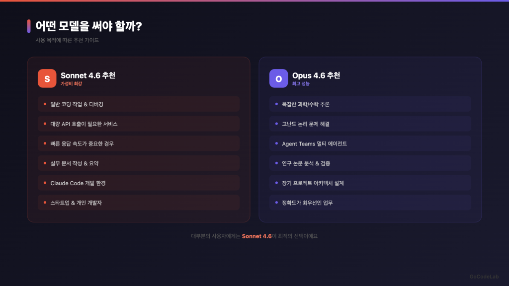 일반 사용자는 Claude Pro 구독 시 두 모델 다 쓸 수 있어요. Free 플랜에서도 Sonnet 4.6이 기본 모델이에요. 필요에 따라 골라 쓰면 돼요.