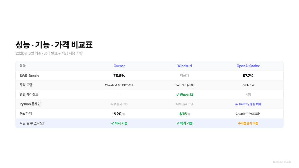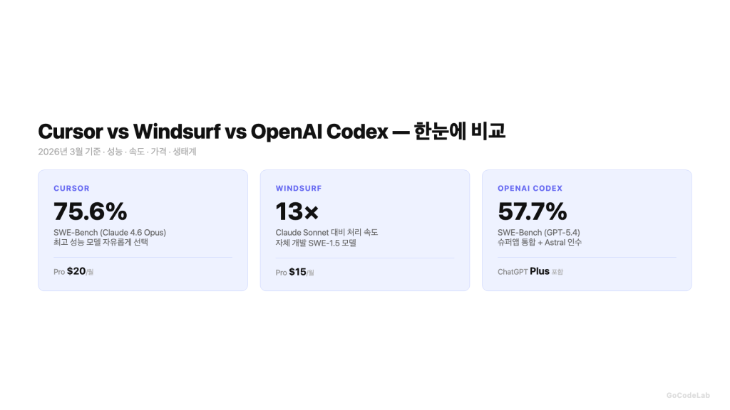 Cursor vs Windsurf vs OpenAI Codex — 2026년 3월, AI 코딩 도구 비교