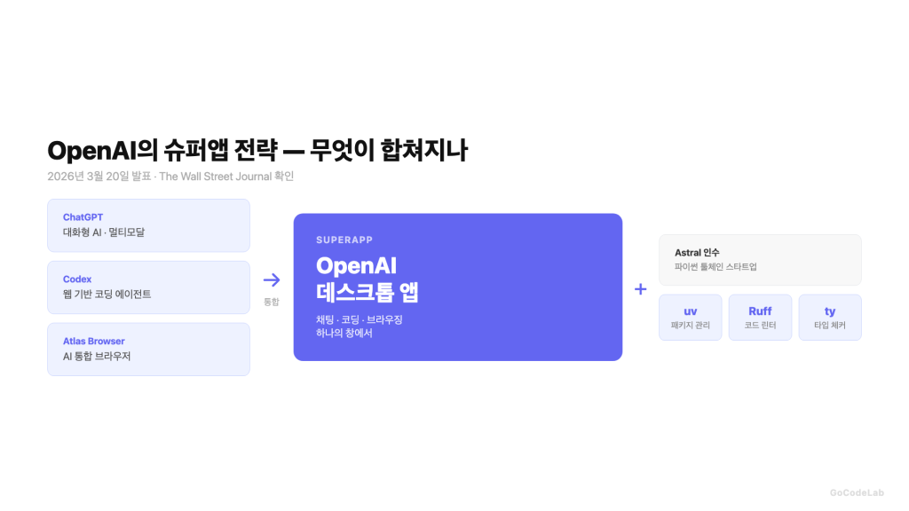 지난 3월 20일, OpenAI가 흥미로운 발표를 했어요. ChatGPT, Codex, Atlas 브라우저를 하나의 데스크톱 슈퍼앱으로 통합하겠다는 내용이었어요. 거기다 파이썬 개발 툴 스타트업 Astral까지 인수했어요. uv, Ruff, ty — 개발자라면 다 아는 툴들이에요.