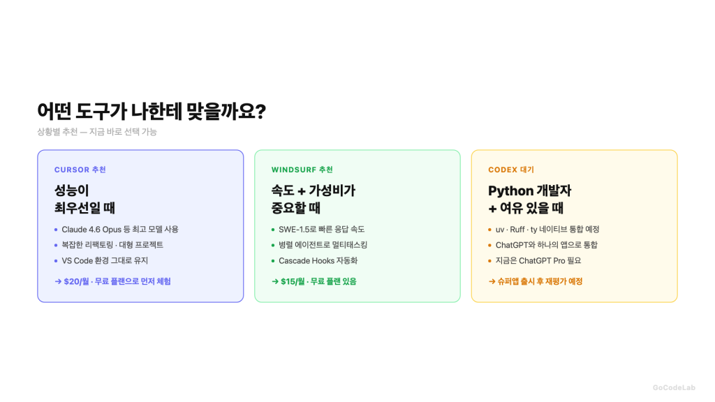 상황별 추천 — Cursor / Windsurf / Codex / GoCodeLab