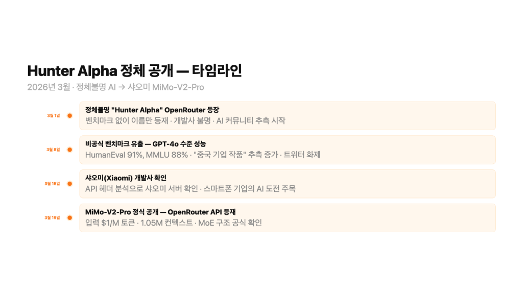- 3월 18~19일: 샤오미가 공식 발표. Hunter Alpha = MiMo-V2-Pro. 테스트 기간 처리 토큰 1조 개 공개.