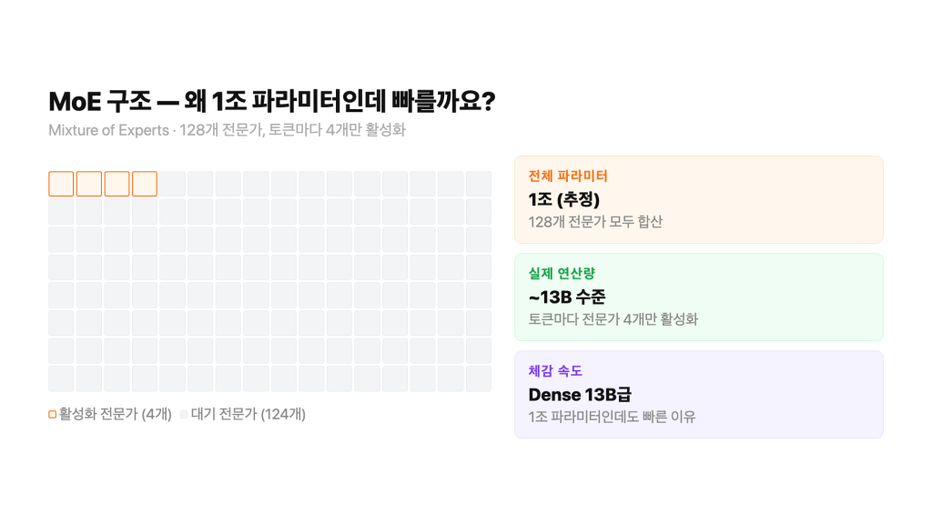두 모델 모두 MoE(Mixture-of-Experts) 구조예요. 전체 파라미터는 1조 개지만, 실제로 활성화되는 건 일부예요. 추론 비용이 낮아지는 구조예요.
