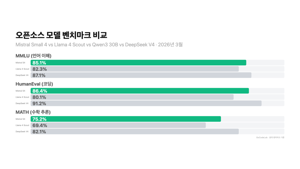 Mistral Small 4의 차별점은 활성 파라미터가 6.5B로 가장 가벼운 편이라는 거예요. GPU 요구사항이 상대적으로 낮아요. 반면 Llama 4 Scout는 컨텍스트 창이 1천만 토큰으로 압도적이에요. 대규모 문서 처리에는 Llama 4가 유리하지만, 빠른 추론 속도와 출력 효율은 Small 4가 앞서요.