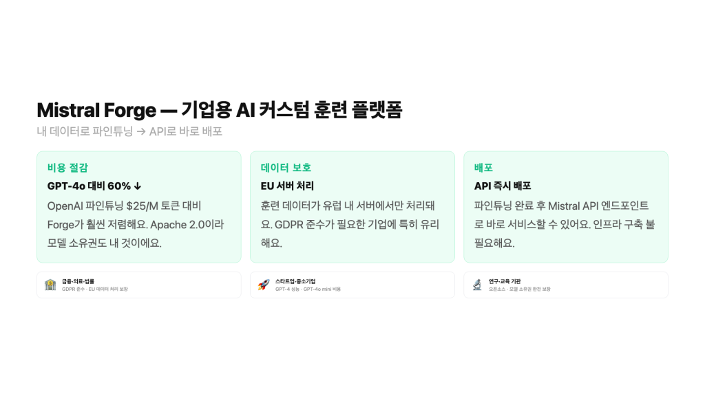 OpenAI GPT-4o 파인튜닝은 훈련 비용 $25/1M 토큰, 추론 비용 $1.25/1K 토큰이에요. Mistral Forge는 정확한 가격이 공개되지 않았지만, Mistral AI가 공식적으로 “OpenAI 파인튜닝 대비 약 40~60% 저렴”하다고 밝혔어요.