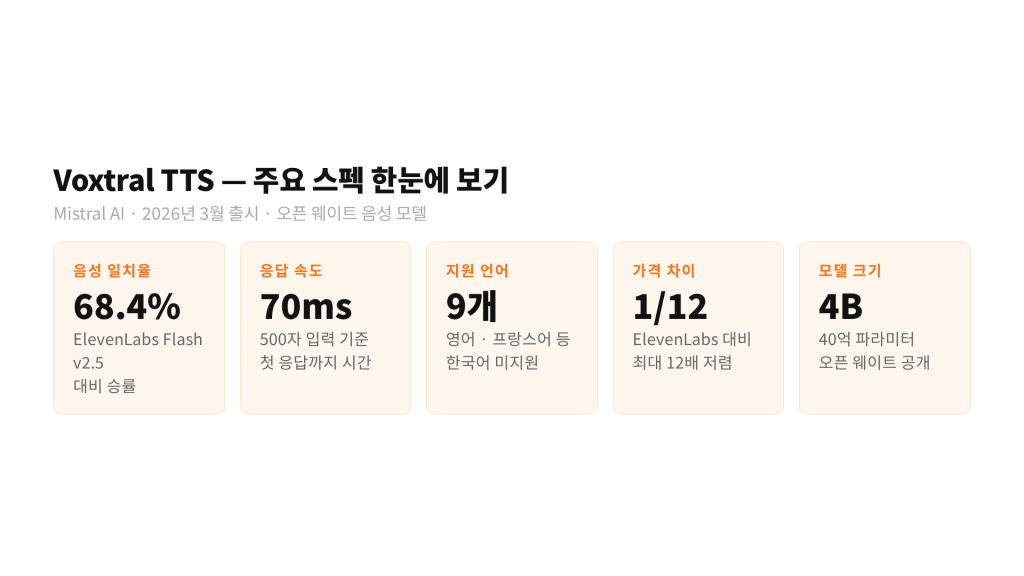 – Voxtral TTS는 4B 파라미터 오픈웨이트 TTS 모델 (2026년 3월 26일 출시)