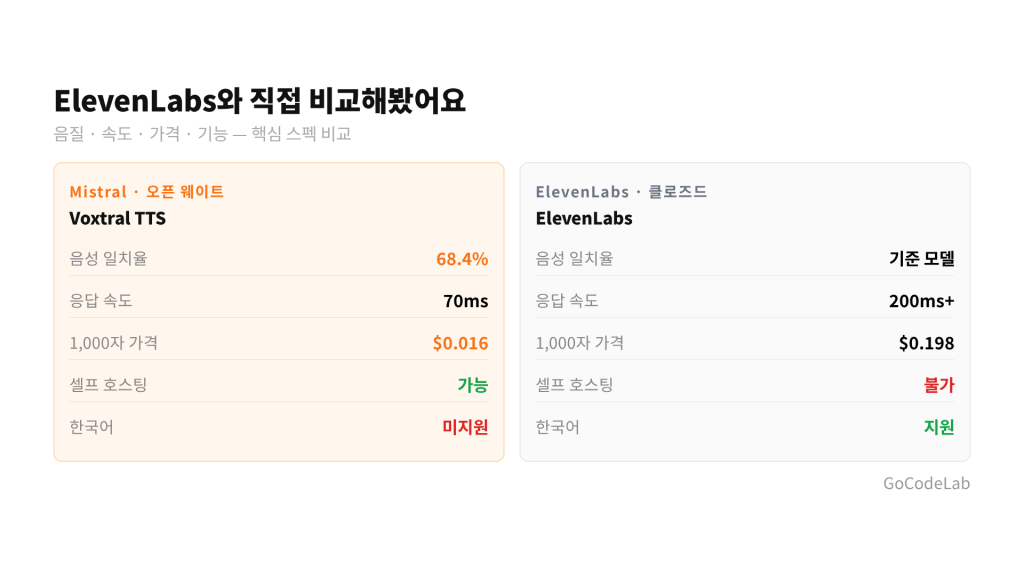 Mistral이 공개한 인간 평가 결과에서 Voxtral TTS가 ElevenLabs Flash v2.5 대비 zero-shot 목소리 복제 비교에서 68.4% 승률을 기록했어요. 또한 ElevenLabs v3(최고급 모델)와 전반적인 음성 품질에서도 비등한 수준을 보였어요. 물론 Mistral이 직접 진행한 평가라서 100% 중립적으로 보기는 어렵고요. 제3자 독립 평가가 나오면 더 신뢰할 수 있을 거예요. 한국어 화자에게 영어 음성의 차이가 얼마나 느껴지는지는 솔직히 개인 차이가 있어요.