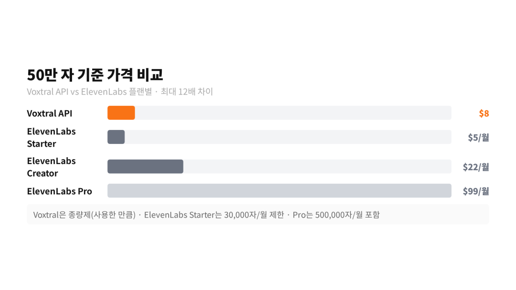 TTS 서비스를 고를 때 가격 차이가 생각보다 커요. Voxtral API를 ElevenLabs Pro와 비교하면 놀라운 결과가 나와요.