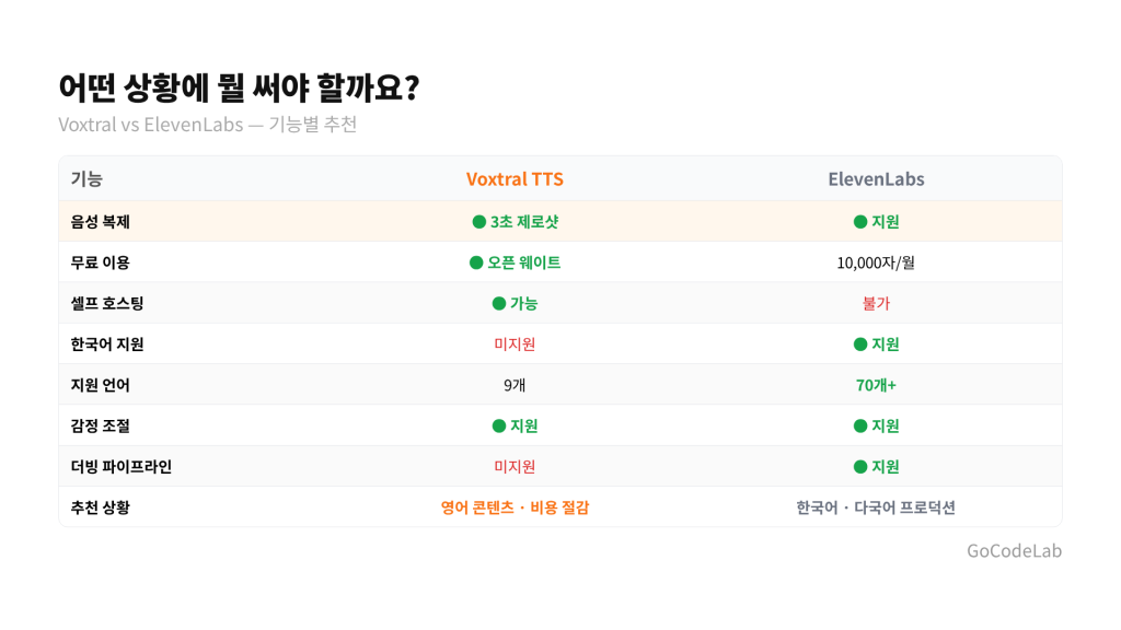 또 ElevenLabs가 지원하는 더빙·번역 파이프라인이 없다는 점도 한계예요. 영어 팟캐스트를 스페인어로 더빙하거나, 영상을 다국어로 재제작하는 작업은 지금 Voxtral만으로는 안 돼요. ElevenLabs의 완성된 프로덕션 파이프라인과 비교하면 아직 갈 길이 있어요.
