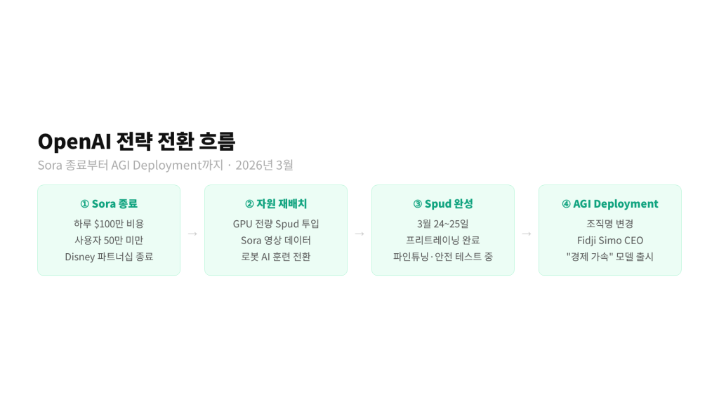 OpenAI가 Sora를 끈 건 실패가 아니에요. 전략적 집중이에요. 하루 $100만짜리 적자 서비스를 접고, 그 자원을 더 중요한 곳에 쓰겠다는 결정이에요. 그 “더 중요한 곳”이 Spud이고, 그 조직이 ‘AGI Deployment’예요. Sora 데이터는 로봇 AI로 흘러가고 있어요.