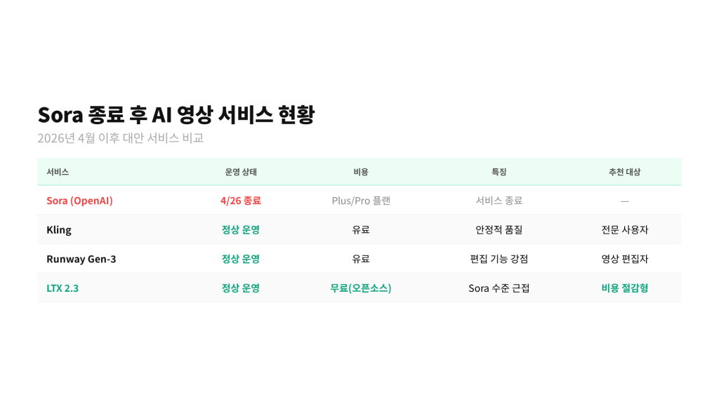 Kling, Runway Gen-3, LTX 2.3(오픈소스)이 현재 활발하게 쓰이고 있어요. LTX 2.3은 무료로 쓸 수 있고, 품질도 Sora에 근접하다는 평가예요. 유료를 감수할 수 있다면 Kling이 현재 가장 안정적이에요. GoCodeLab에 LTX 2.3 비교 글이 있으니 참고해요.