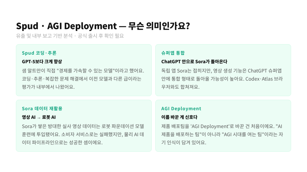 OpenAI는 ChatGPT, Codex, 브라우저(Atlas)를 하나로 합친 슈퍼앱을 계획하고 있어요. Spud는 이 슈퍼앱의 기반 모델이 될 가능성이 높아요. 텍스트, 코드, 브라우징, 에이전트 작업을 하나의 모델이 통합 처리하는 구조예요.