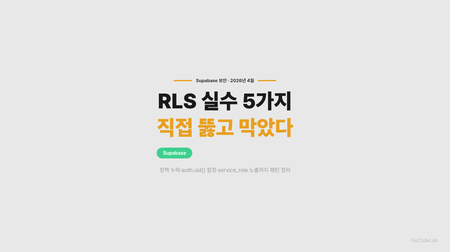 Supabase RLS에서 자주 나오는 실수 5가지를 직접 재현하고 데이터가 새는지 확인했다. auth.uid() 누락, policy 순서 문제, anon 권한 방치까지 — 실제로 뚫린 패턴과 막은 방법을 코드와 함께 정리했다.